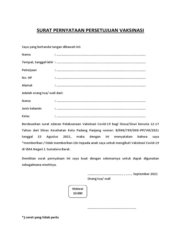 Jika tidak bersedia divaksin berikan alasan dan bukti surat keterangan dari yang . Create date august 4, 2021 . Menyatakan dengan sesungguhnya bahwa saya selaku orang tua/wali siswa. Diberikan oleh tim vaksinasi rs pku muhammadiyah surabaya. Surat pernyataan bersedia divaksin bagi orangtua/wali siswa untuk persyaratan daftar ulangsman 4 palangka raya.