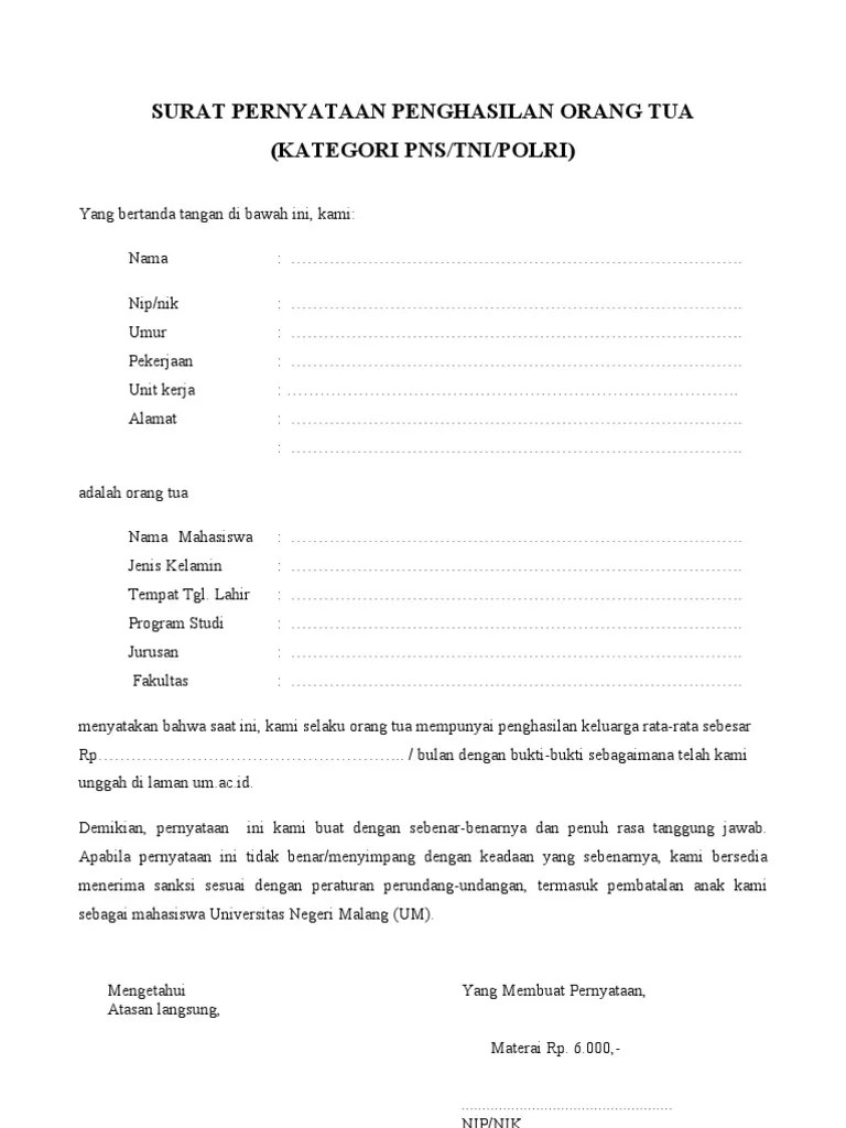 Surat Keterangan Penghasilan Orang Tua Um - Pengumuman Seleksi Calon Mahasiswa Penerima Bidikmisi Jalur Um Ptkin 2018 - Surat pernyataan tidak sedang menerima atau mengajukan beasiswa lain.. Yang bertanda tangan di bawah ini, kami:. Menyatakan bahwa saat ini, kami selaku orang tua/wali mempunyai penghasilan kotor dan penghasilan tambahan keluarga (gabungan suami dan istri), . Surat pernyataan tidak sedang menerima atau mengajukan beasiswa lain. Surat keterangan ini diberikan untuk melengkapi persyaratan administrasi permohonan beasiswa ke. Surat keterangan penghasilan orang tua yang bertanda tangan di bawah ini, saya :